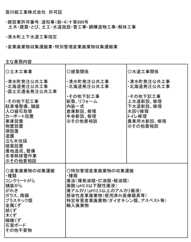 笹川組工業株式会社は、北海道十勝の地域において、主に公共工事(土木・水道・建築)民間工事(一般住宅外構工事・修繕工事)等おこなっております。大規模で複雑な事業から小規模な業務まで、あらゆることに懸命に取り組む専門スタッフにより成り立っております。常に優れたものを提供し続けたいとの思いを原動力として、私たちは当社の業務によって、お客様に十分にご満足いただけるよう、いかなる努力も怠りません。お住まいでお困りのことが御座いましたら今すぐお電話いただき、相談のご予約をお取りください。